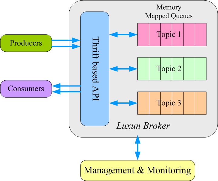 - BigQueue라는 Memory mapped file 기반 시스템 사용. (성능상 우위를 내는 주요 요인)