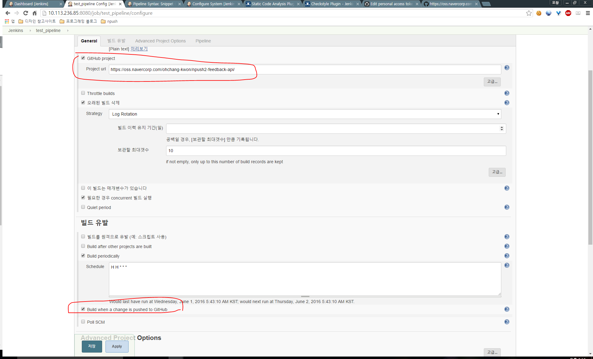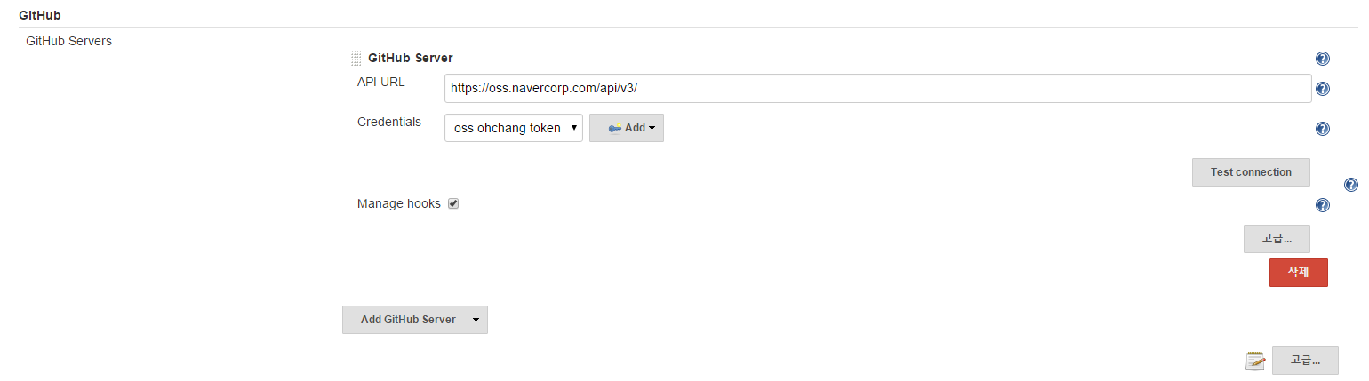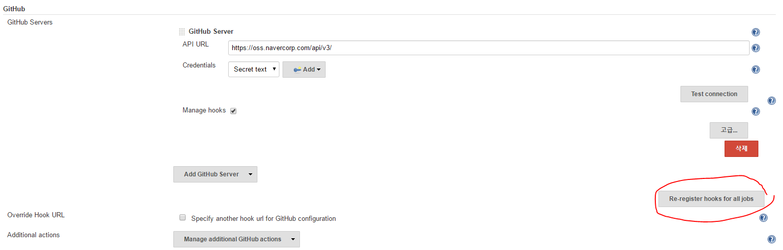 다시 GitHub 설정으로 가서 고급... 버튼을 누르면 추가로 나타나는 옵션 중 위 사진의 버튼을 눌러서 다시 Hook을 등록 시도 해보면 됨.
