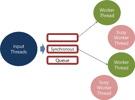 Input Threads + Worker Threads Synchronous Queue에서는 이벤트를 즉각적으로 비어있는 워커 쓰레드로 보내는 역할. 만약 모든 워커 쓰레드가 바쁜 상황이라면 가능해질 때까지 작업을 중지함. Worker Thread에서 Filter, Output 작업 수행